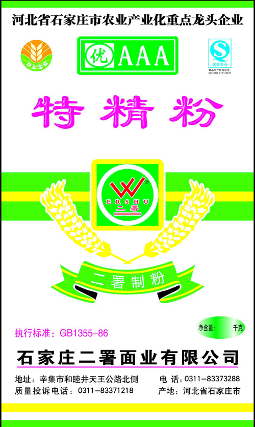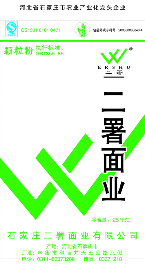 河北面業         二署面業有限公司創建于1989年,現已具備日處理小麥300噸的能量,產品質量穩定,深受客戶青睞。 二署面業地理位置優越,北靠307國道石黃高速,南鄰石德鐵路,衡井國道,交通十分方便,為貨物運輸提供保證及時運輸的天然條件。產品運銷:黑龍江、吉林、遼寧、河北、內蒙、陜西、山西等大中省份,贏得了廣大消費者的認可。 河北面業